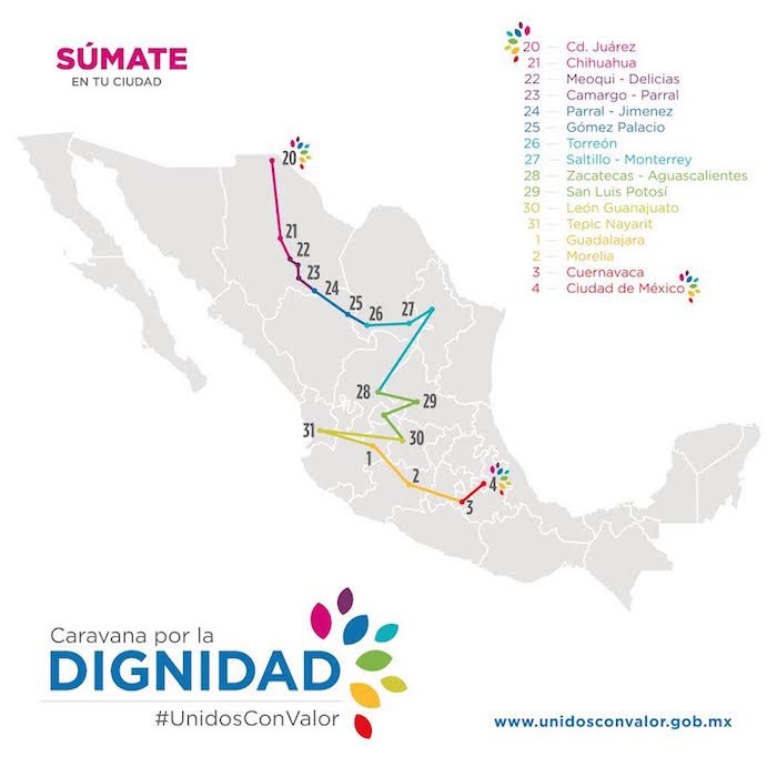 En los próximos 15 días, al Caravana transitará por Coahuila, Nuevo León, Zacatecas, Aguascalientes, San Luís Potosí, Guanajuato, Nayarit, Jalisco, Michoacán, Morelos y, finalmente, llegará a la Ciudad de México el 4 de febrero.