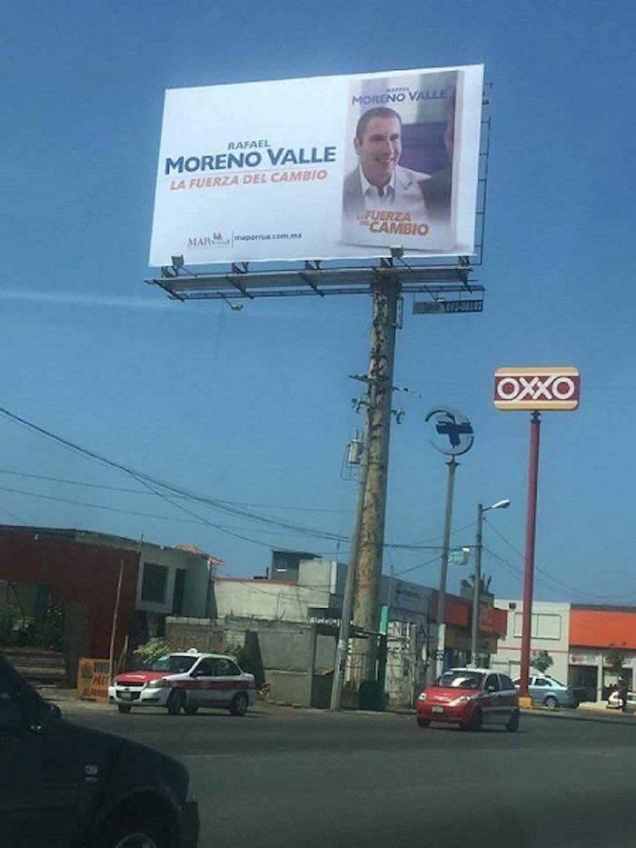 Periódico Central constató este fin de semana que los espectaculares con la foto del ex Mandatario, Rafael Moreno Valle, se encuentran en la autopista México-Puebla, así como en Veracruz; el Instituto Nacional Electoral (INE) emitió medidas cautelares el año pasado para que el la panista poblano se abstuviera de promocionarse en espectaculares.