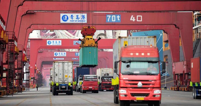 Varios camiones transportan contenedores en un puerto en Qingdao, China. Foto: EFE/Archivo