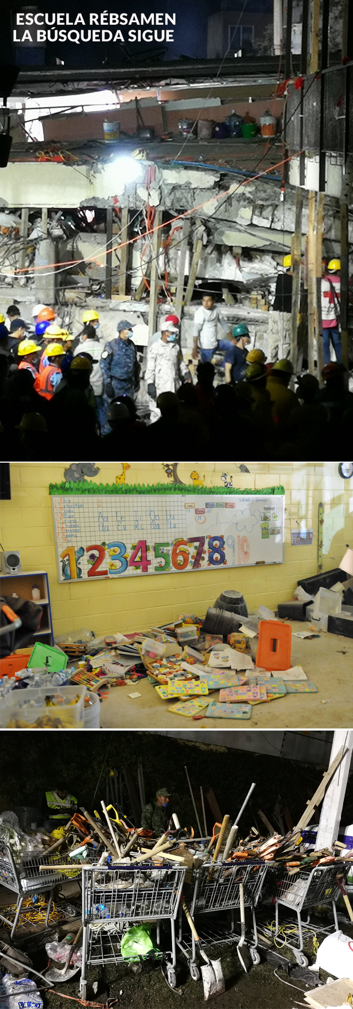 Uno de los esfuerzos de rescate más desesperados ocurría en la escuela Enrique Rebsamen, ubicada en la calle de las Brujas y Madero, donde un ala del edificio de tres pisos se derrumbó en un enorme montón de losas de concreto dejando atrapados a niños.