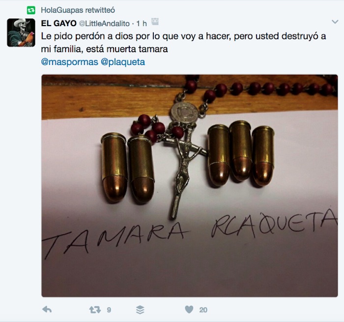 Artículo 19 destacó que el usuario @LittleAndalito publicó una foto de un papel escrito con el nombre de la periodista, acompañado de unas balas y un rosario. Ahí escribe: “Le pido perdón a dios por lo que voy a hacer, pero usted destruyó a mi familia, está muerta tamara”.