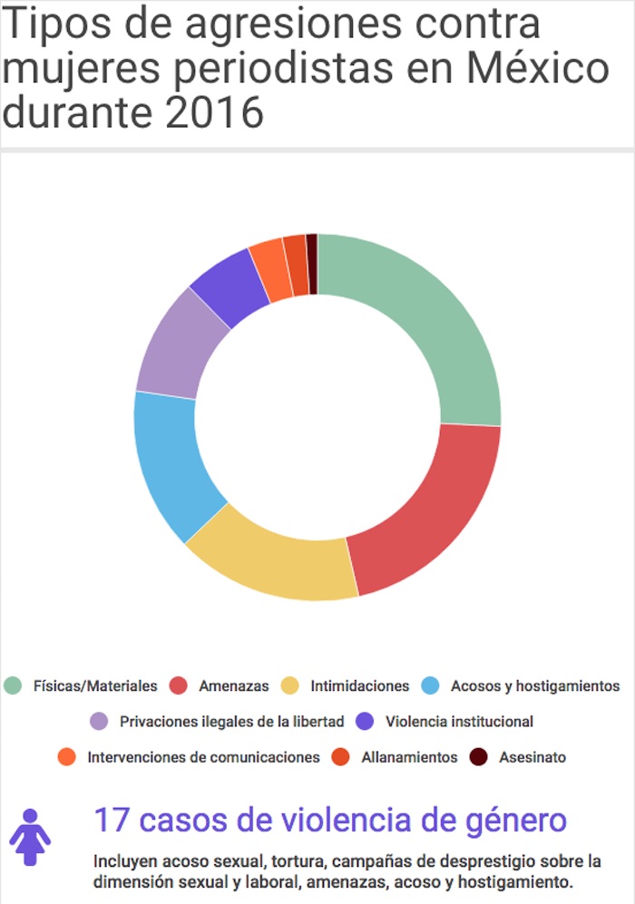 Los defensores de derechos humanos de comunicadores documentaron en 2016 97 agresiones en contra mujeres; de las cuales 17 tuvieron un componente de violencia diferenciada de género; 8 de estas agresiones ocurrieron en Internet.