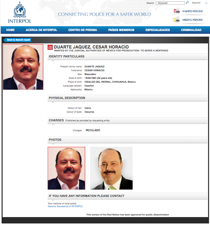 César Duarte es buscado por la Interpol en 192 países por el delito de peculado.