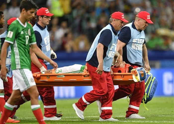Salcedo se lastimó en el primer tiempo al chocar dentro del área con el delantero neozelandés Chris Wood y caer mal. Salcedo quedó de rodillas en el césped agarrándose el hombro izquierdo, mientras las acciones continuaban. Wood incluso remató al arco, lo que enfureció al técnico de México, Juan Carlos Osorio, que gritó improperios hacia la banca rival.