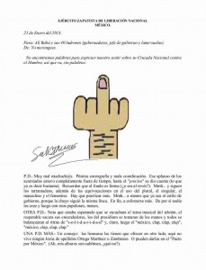 Ciudad de México, 22 de ene (SinEmbargo).- El Ejército Zapatista de Liberación Nacional publicó una carta dirigida a "'Alí Baba y sus 40 ladrones' (gobernadores, jefe de gobierno y lame-suelas)", en respuesta a la Cruzada Nacional contra el Hambre que impulsó el día de ayer el Presidente Enrique Peña Nieto en el municipio Las Margaritas, Chiapas, uno de los sitios donde la guerrilla, encabezada por el "subcomandante Marcos", dio a conocer al mundo su rebelión armada para revertir las condiciones de miseria y de injusticia de los pueblos nativos de México.