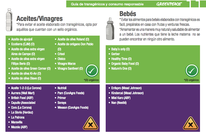 Greenpeace elaboró la primera versión de la guía en 2010 y fue actualizada durante la primera mitad de 2012. En ésta alerta a los consumidores de los productos y las marcas que pueden contener al menos un ingrediente o aditivo producido a partir de los cultivos transgénicos con producción comercial: soya, maíz, algodón y canola, que por lo tanto son “sospechosos” de ser transgénicos.
