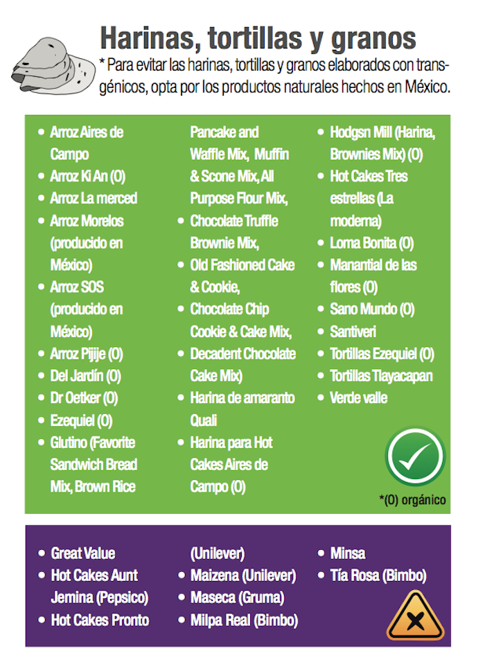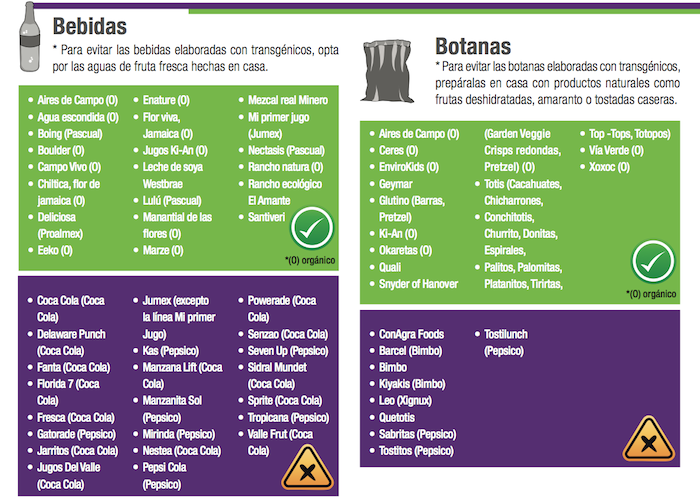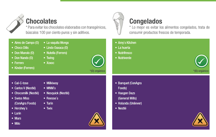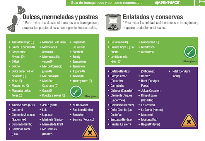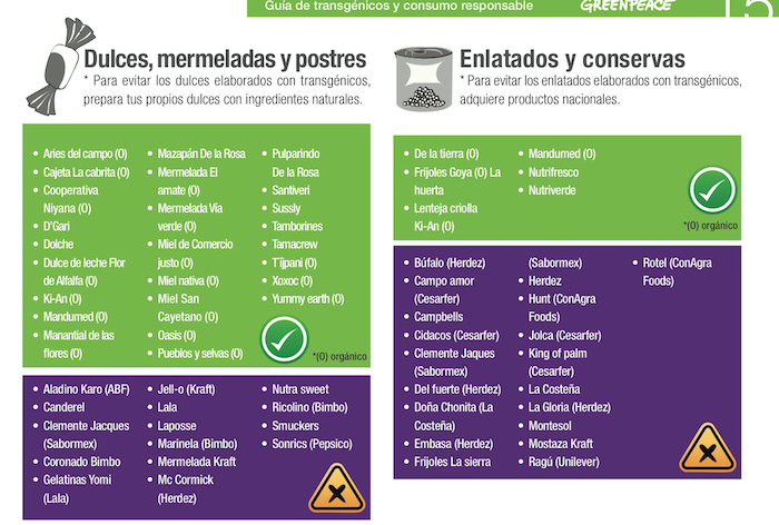 En el documento Guía de transgénicos y consumo responsable, Greenpeace detalla un listado de bebidas, aceites, botanas, chocolates, congelados, dulces y postres, enlatados y conservas, además de harinas, tortillas y granos que son elaborados con transgénicos.