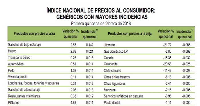 Al interior de este índice, los productos que registraron mayor alza en la primera quincena de febrero fueron: gasolina (2.55 por ciento), huevo (2.69 por ciento), transporte aéreo (9.23 por ciento), plátanos (4.88 por ciento) y pollo (1.02 por ciento).