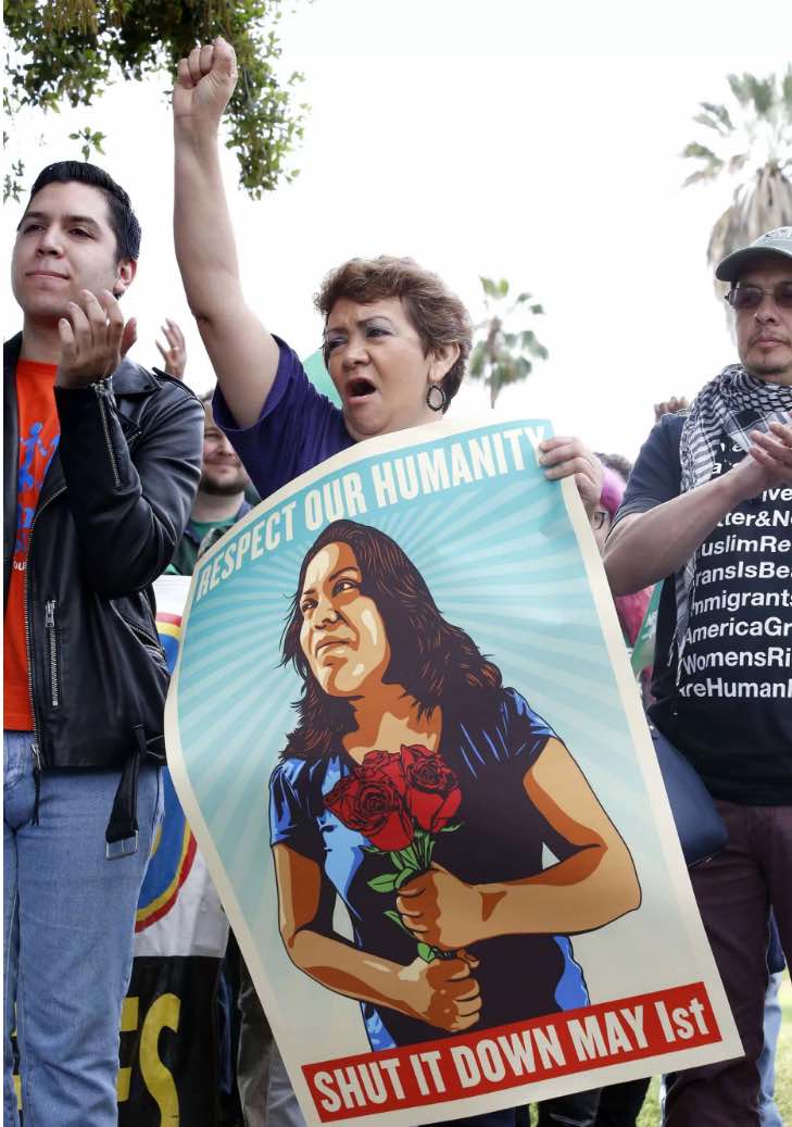 Esta mujer se unió a manifestantes y líderes comunitarios el miércoles por la mañana en el parque MacArthur para aplaudir el esfuerzo que se plantea para el día 1 de mayo: el día que el mundo entero dedica a la defensa de los trabajadores, una coalición de más de 56 organizaciones pro derechos civiles, sindicatos e iglesias se unirá para la marcha a la que han llamado “Los Ángeles Resiste”.