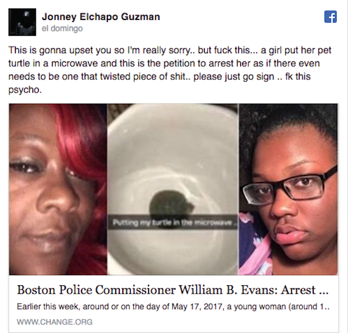 Los comentarios en las redes sociales se multiplican a cada minuto. "Esto te molestará y lo siento mucho. Una joven puso su pequeña tortuga en el microondas y ésta es la petición para arrestarla", escribió en Facebook el usuario identificado como Jonney Elchapo Guzman.