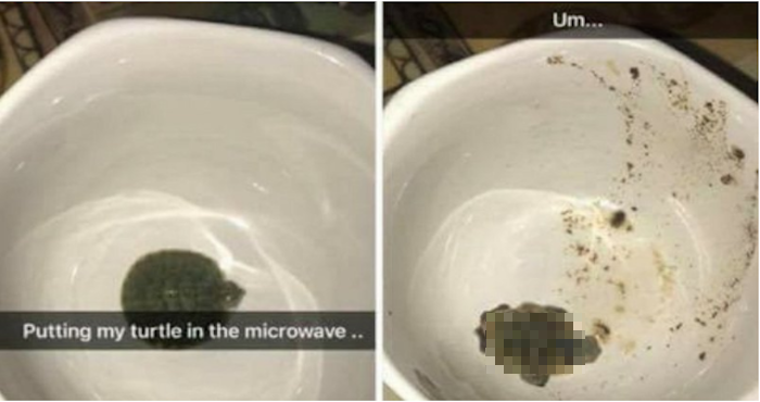 Jonasia Simpson creyó divertido mostrarle a sus seguidores el antes y después de un experimento con su pequeña mascota. Mostró las imágenes de la tortuga en un recipiente antes de colocarla en el microondas cuando aún estaba viva y cuando la sacó, estallada.