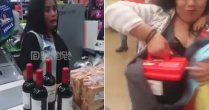 En las primeras escenas, captadas en una Bodega Aurrera en la delegación Gustavo A. Madero, de la Ciudad de México, se observa cómo una joven fue sorprendida cuando intentaba irse de la tienda con cuatro botellas de vino.