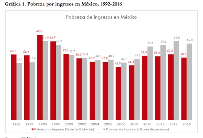 El documento reveló también que la pobreza hace 25 años era similar en proporción a la medición de 2014: 53 por ciento de la población, y el dato más reciente correspondiente a 2016 sigue siendo poco más de la mitad de la población: 50.1 por ciento. Con la diferencia de que hoy, por el crecimiento poblacional son casi 11 millones más de personas que padecen esa situación.