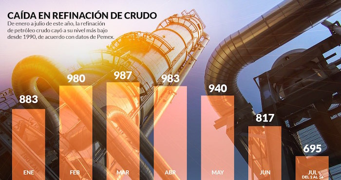 La Empresa Productiva del Estado refinó 695 mil barriles diarios de crudo, equivalente a alrededor del 42 por ciento de la capacidad de refinación de México, del día primero al 16 de julio, según datos preliminares de la compañía. La última vez que la producción fue tan baja fue en diciembre de 1990.