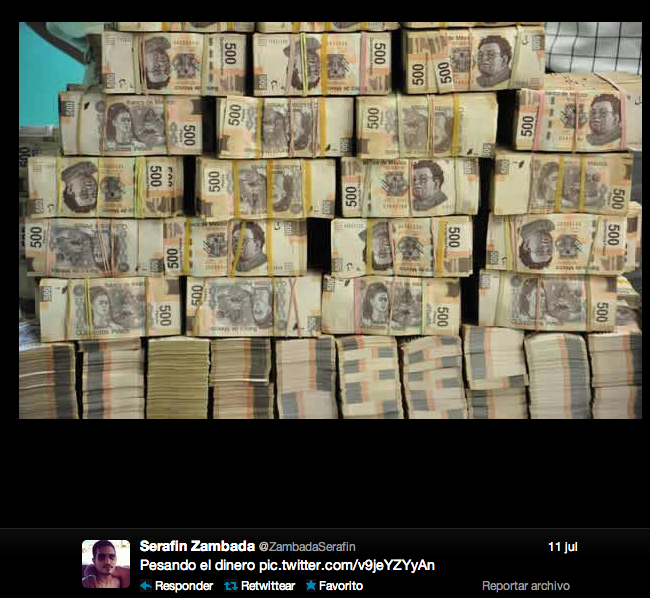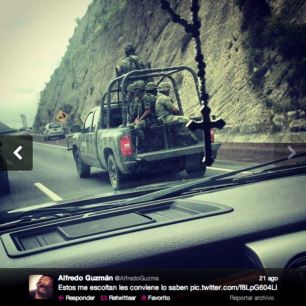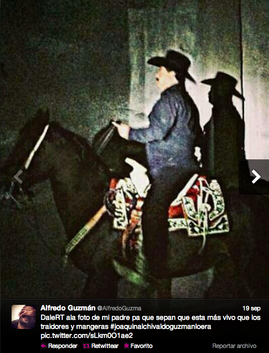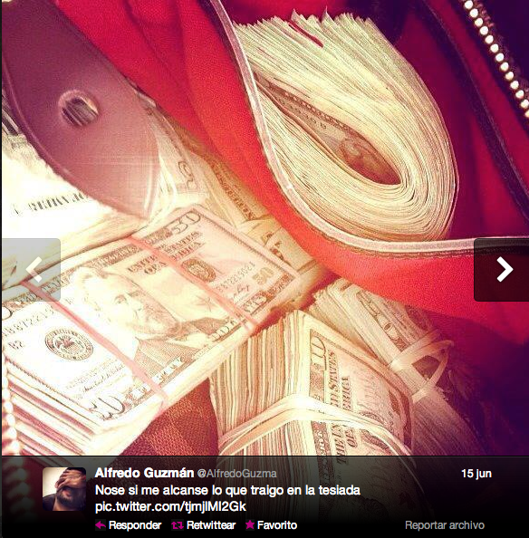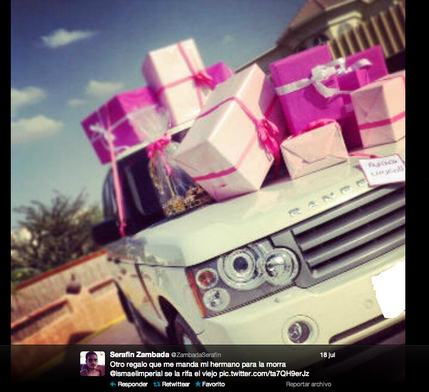 Entre los tuits de Serafín hay algunas menciones hacia Alfredo Guzmán [@AlfredoGuzma], supuesto hijo de Joaquín Guzmán Loera,"El Chapo", quien también gusta de mostrar sus posesiones en Twitter, entre ellos paquetes de droga, botellas de bebidas alcohólicas, billetes y hasta un pequeño tigre, parecido al que también tuiteó Serafín Zambada.