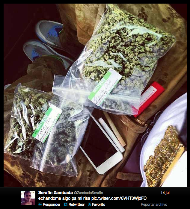 En otra de sus fotografías, a la que añade el texto "echandome algo pa mi risa", muestra dos bolsas de mariguana hidropónica.