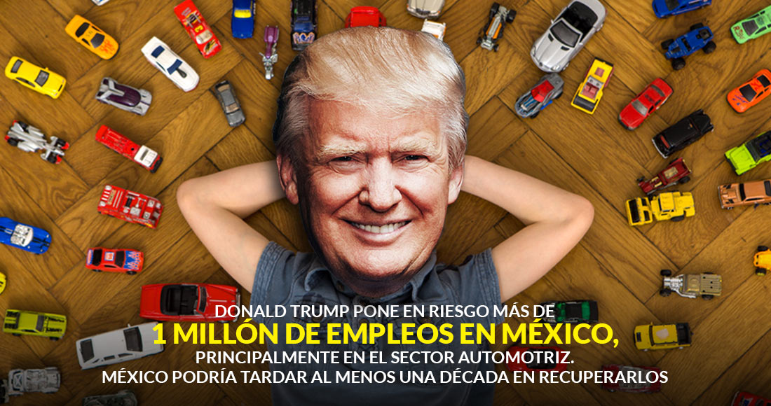 Ciudad de México, 23 de enero (SinEmbargo).- Desde el pasado 8 de noviembre, día en que los habitantes de Estados Unidos lo eligieron como su nuevo Presidente, a la fecha, Donald Trump se llevó de México 14 mil 300 empleos que las Big Three (General Motors, Ford y Chrysler), generarían a partir de la instalación de nuevas plantas.