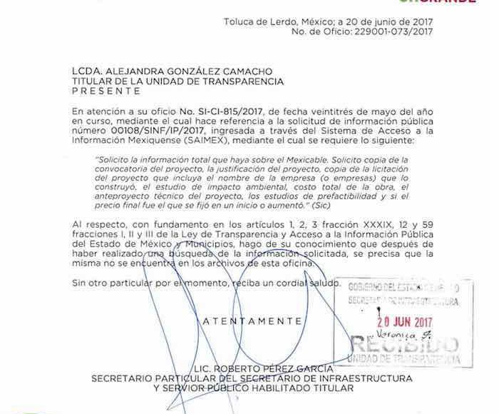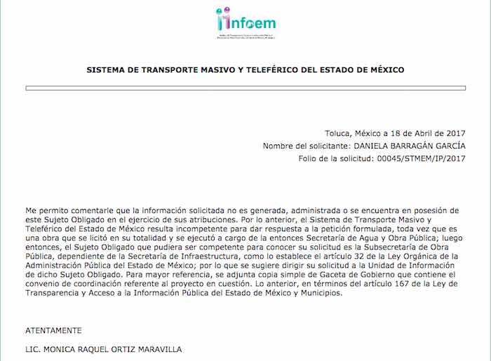 Es decir, la Secretaría de Infraestructura remite al Sistema de Transporte Masivo y Teleférico del Estado de México para obtener la documentación, pese a que éste último indicó que no lo tiene.