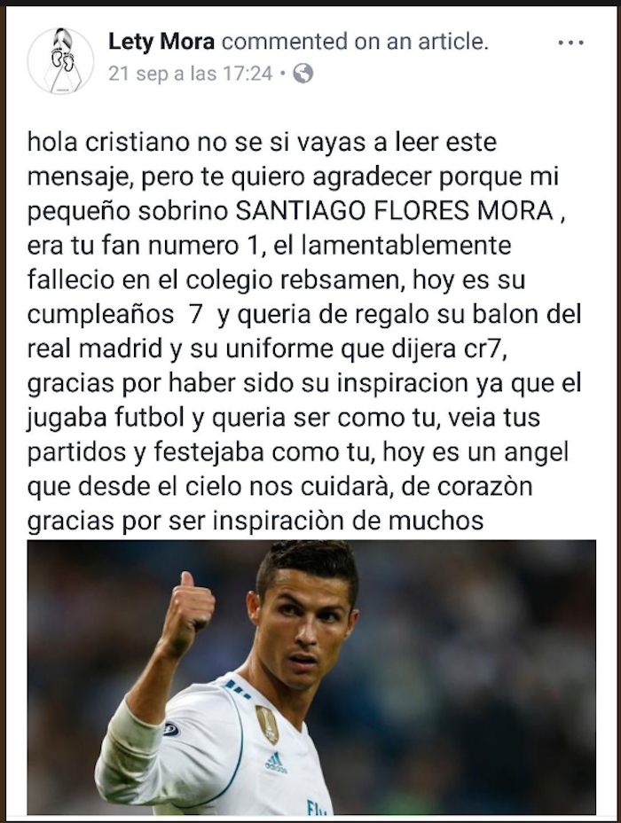 Una de ellas es la de Santiago Flores, pequeñín de seis años quien lamentablemente no logró ser de los 11 niños que lograron rescatar con vida de su escuela. A los seis años de edad, los sueños van más allá de las aulas, libros y números, y por lo regular se refugian en una figura inspiracional. En alguien a quien creemos superlativo, inigualable y tal vez un tanto inalcanzable. En el caso de Santiago, su ídolo era el mejor futbolista del planeta, Cristiano Ronaldo.
