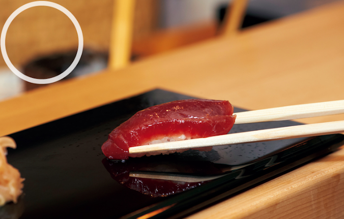 Como Jiro Ono hace sushi con un toque extremadamente ligero, contiene mucho aire. Cuando se coloca en el plato, aterriza suavemente, por lo tanto no es fácil de agarrar. No hay que recogerlo de las orillas, sino levantarlo suave hacia arriba para mantener su forma.
