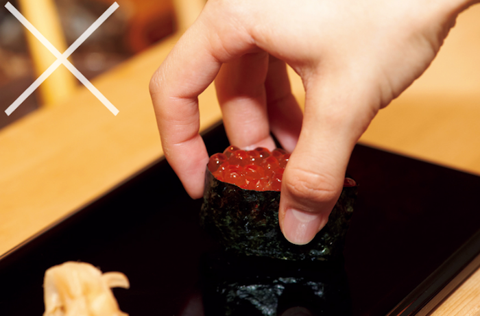Si se toma con los dedos desde la parte de arriba, la cobertura se caerá cuando se lleve a la boca. En lugar de ello, levante el sushi suavemente tomándolo de los lados y cómalo de una sola mordida.