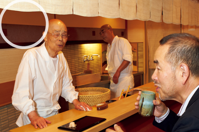Para limpiar el paladar, Jiro Ono cree que beber té es lo mejor. El agua también está permitida para los clientes que consideren el té muy caliente.