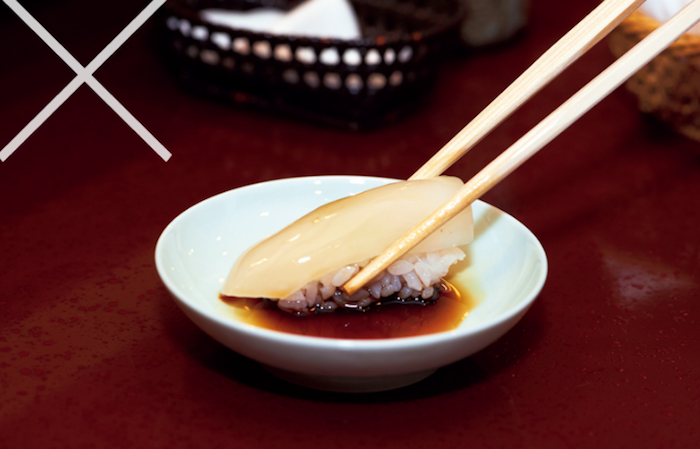 No se debe de levantar el sushi para mojarlo en el plato de soya o si se moja el arroz, perderá su sabor.