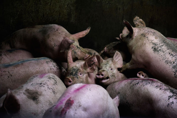 Un grupo de cerdos aguarda en una estancia previa a la zona de sacrificio en un matadero de Atizapán, México. La ley exige que los cerdos sean conducidos al cajón de aturdimiento y allí les sea aplicada una descarga eléctrica. Sin embargo en este matadero, al igual que sucede en otros, los cerdos son dirigidos a la zona de sacrificio sin aturdimiento previo y son degollados plenamente conscientes.