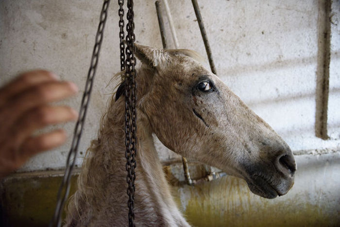 En el matadero frigorífico de Arriaga, México, este caballo llegó con un problema de movilidad que le impedía acceder por sí mismo al cajón de aturdimiento. Fue arrastrado por una cadena sujeta al cuello y murió de asfixia tras varios minutos suspendido.