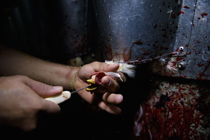 Un pollo es sacrificado sin aturdimiento previo en un pequeño matadero familiar de Izucar de Matamoros, México. La ley prohíbe expresamente sacrificar animales sin haber sido previmente aturdidos.