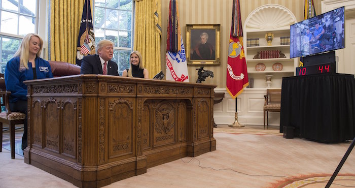 Desde el Despacho Oval, sentado junto a su hija Ivanka y la astronauta Kate Rubins, Trump dio la enhorabuena a Whitson "en nombre de toda la nación" por su "increíble récord".