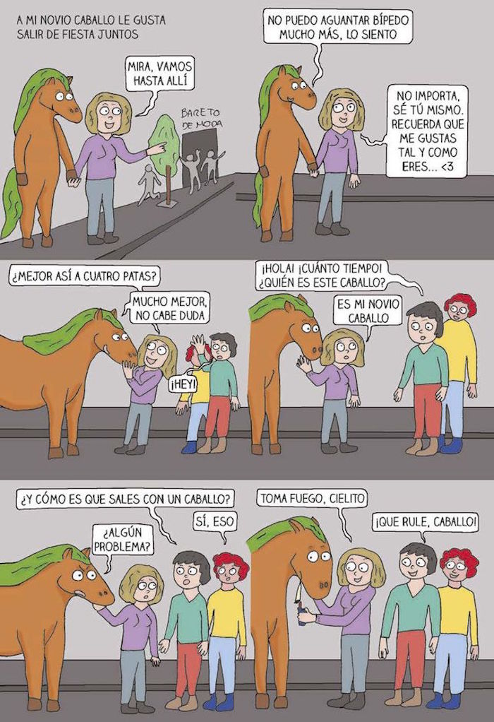 Madrid/Ciudad de México, 25 de abril (ElDiario.es/SinEmbargo).- La portada produce extrañeza, las primeras páginas pueden llegar a incomodar, pero en la página 20 es imposible dejar de leer. Mi novio Caballo es un cómic protagonizado por una pareja formada por una treintañera y un caballo porque, de acuerdo con su creadora Xiomara Correa, fue lo "más bestia" que se le ocurrió.