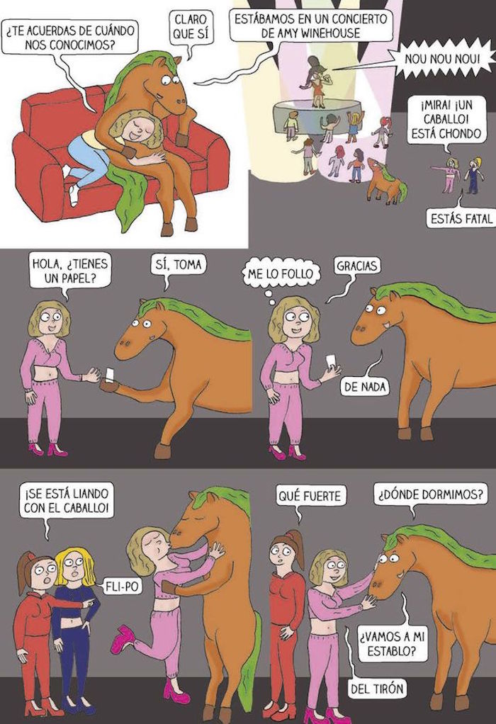 Las amigas de la protagonista del cómic alucinan porque ha terminado con un caballo. Foto: Eldiario.es.