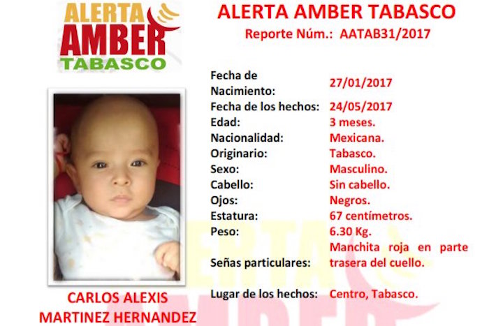 Carlos Alexis Martínez Hernández, de 3 meses de edad, fue raptado de su hogar en Tabasco. Marbeli Alvarado López, empleada doméstica, sería la responsable, según autoridades.