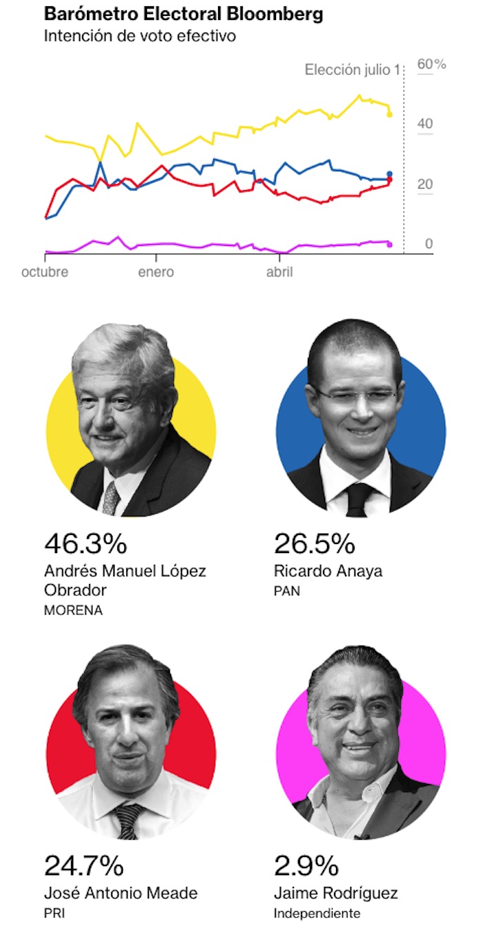 Bloomberg: AMLO cae a 46.3%, pero mantiene una gran ventaja sobre Anaya (26.5%) y sobre Meade (24.7%)