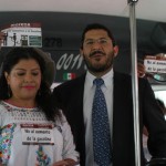 Un niño de unos dos años de edad, sentado en las piernas de su madre en el asiento, justo detrás del chofer, fijaba sus ojos negros y pequeños en Batres mientras hablaba. Desviaba su atención de vez en vez a los volantes que entregaba Brugada, hasta que la comitiva de Morena bajó del autobús.