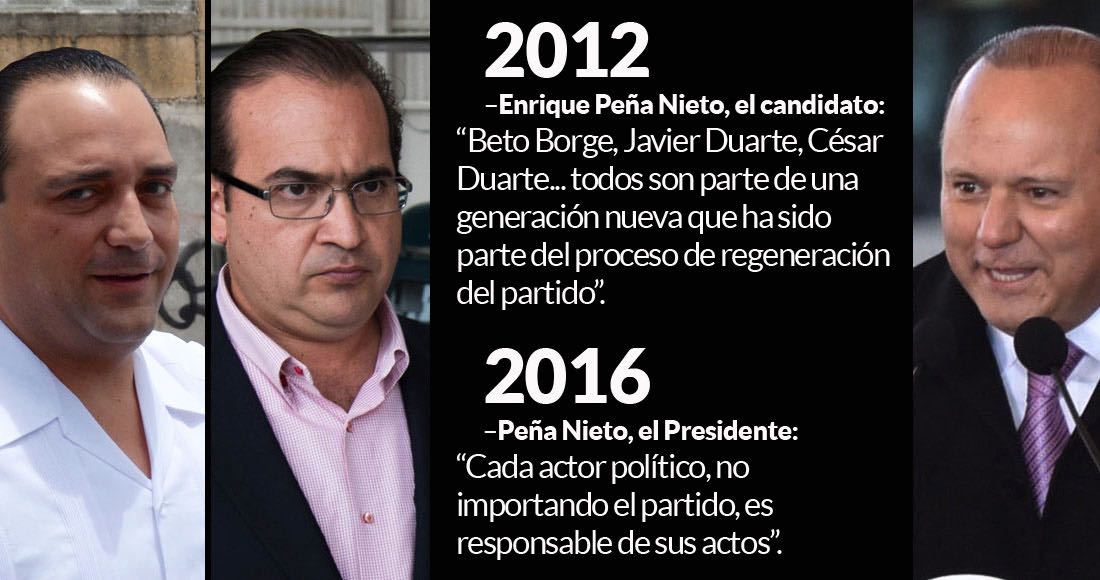 En 2012, cuando Peña Nieto era candidato presidencial dijo durante su participación en el programa de Televisa "Tercer Grado", que los gobernadores de Chihuahua, César Duarte, de Veracruz Javier Duarte y de Quintana Roo, Roberto Borge eran el más claro ejemplo de la nueva generación de políticos priistas.