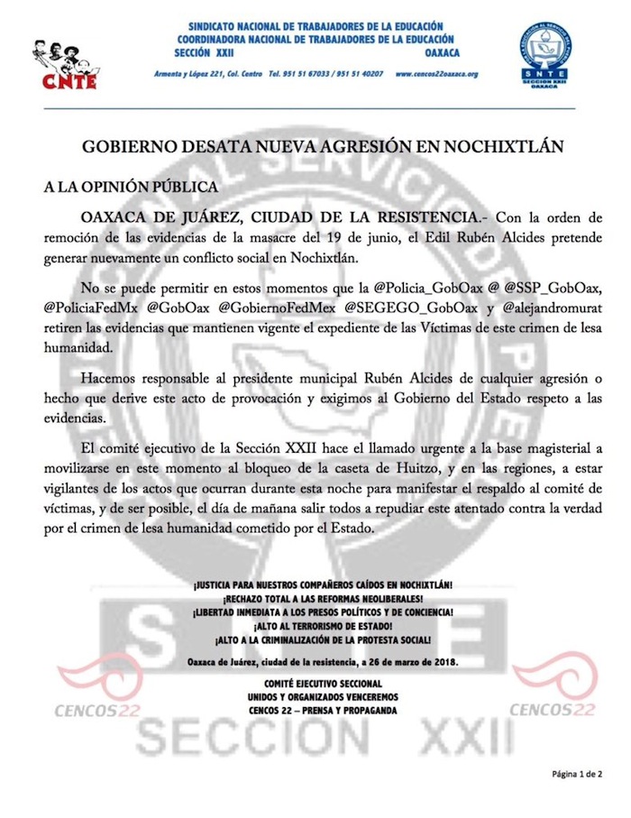 El comité Ejecutivo Nacional de la Sección XXII de la Coordinadora Nacional de Trabajadores de la Educación (CNTE), emitió un comunicado en el cual responsabilizan al presidente municipal de "cualquier agresión o hecho que derive de este acto de provocación".