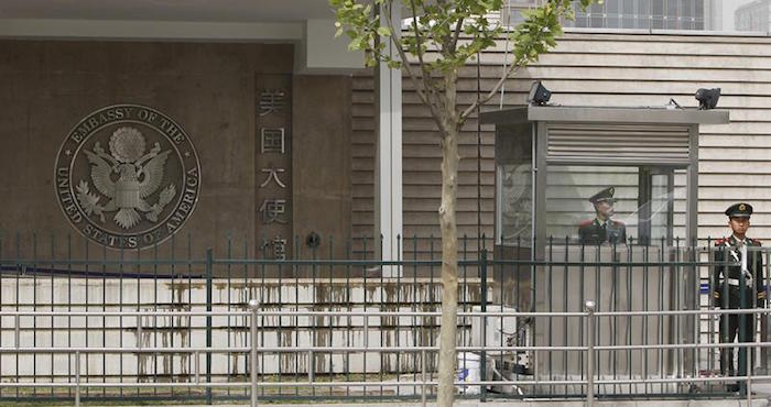La policía china ha acordonado la entrada este de la embajada, en la avenida de Tianze, en el noreste de Pekín. Se trata de la zona donde está la entrada para realizar trámites de visados, por lo que suele estar muy concurrida.