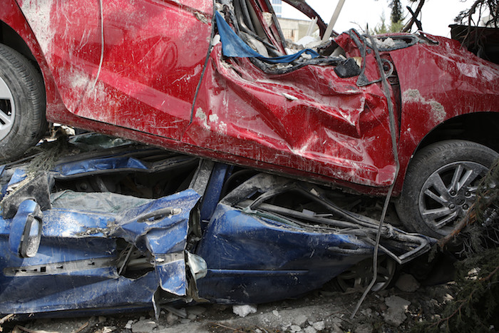 En la imagen, tomada el 25 de septiembre de 2017, dos autos aplastados tras el sismo de magnitud 7.1 que remeció la capital mexicana el 19 de septiembre, siguen en las inmediaciones de una fábrica téxtil que se vino abajo en la Ciudad de México. Foto: Rebecca Blackwell, AP.