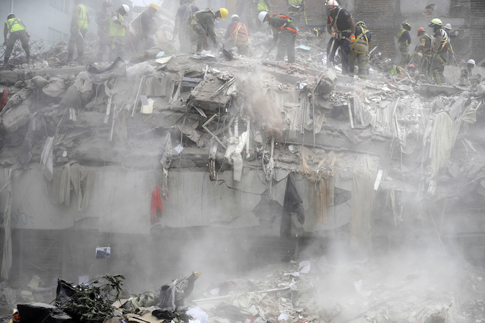 Trabajadores limpian escombros del techo de un edificio derrumbado por el sismo de magnitud 7.1 de la semana pasada en la esquina de las calles Gabriel Mancera y Escocia, colonia Del Valle, Ciudad de México, 25 de septiembre de 2017. Foto: Rebecca Blackwell, AP.