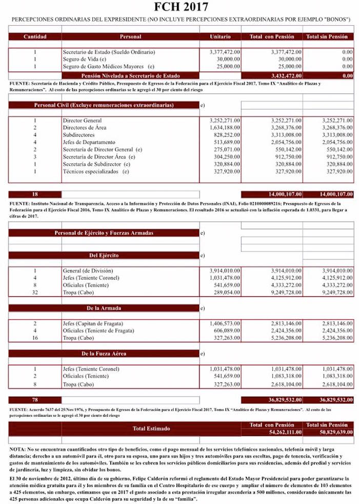 López Obrador publicó una tabla de las percepciones ordinarias de Felipe Calderón, en la que no se incluyen los ingresos extras, como los bonos que aún recibe. De acuerdo con los datos proporcionados por el líder de Morena –que cita al Ifai–, el ex Presidente ahora percibirá 50.8 millones de pesos, luego de que anunciara que donaría su pensión a niños con cáncer. Este martes, el ex Presidente de México acusó al tabasqueño de ser un hombre mezquino e incapaz de reconocer un gesto de generosidad, no de él, sino de cualquier persona.