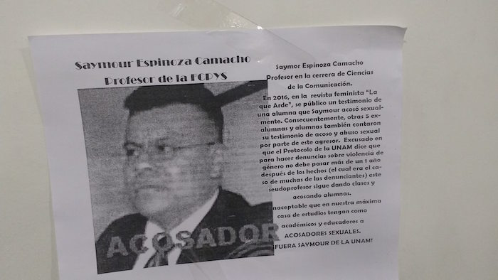 Ciudad de México, 27 de abril (SinEmbargo).- Estudiantes protestaron contra Seymur Espinoza Camacho, profesor de la Facultad de Ciencias Políticas y Sociales (FCPyS), quien es señalado de agredir y acosar sexualmente a sus alumnas.