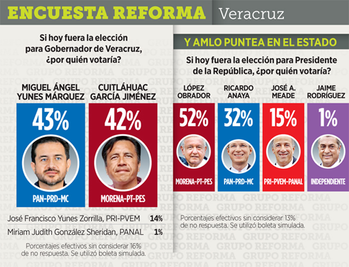 El anuncio se da cuando faltan 34 días para las elecciones. El hijo del Gobernador veracruzano y el candidato del Movimiento de Regeneración Nacional (MORENA) están empatados en las encuestas. Miguel Ángel Yunes Márquez, hijo de Miguel Ángel Yunes Linares y candidato de los partidos Acción Nacional (PAN), de la Revolución Democrática (PRD) y Movimiento Ciudadano, tiene 43 por ciento de las preferencias electorales, según el último sondeo de Reforma. Cuitláhuac García Jiménez, de Morena, lo alcanzó con 42 por ciento.