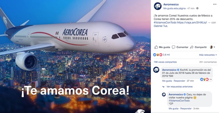 No sólo las empresas surcoreanas aprovecharon la victoria de Corea del Sur para promocionarse entre los mexicanos. La mexicana Aeroméxico publicó en su cuenta de Facebook una promoción del 20 por ciento de descuento para sus vuelos al país asiático a partir de 1 de Julio y hasta 28 de febrero de 2019: