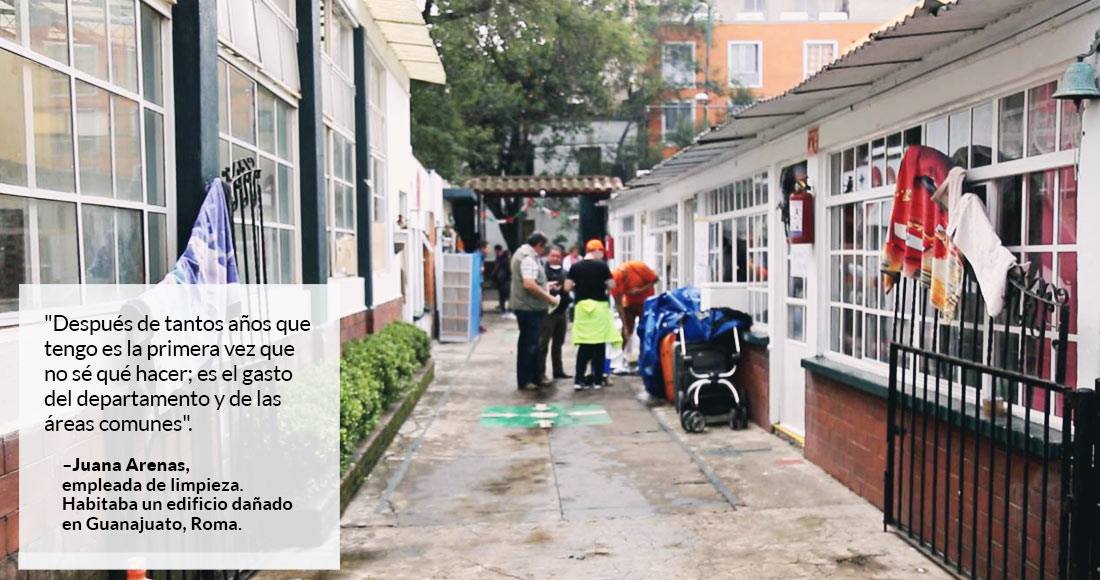 El Gobierno capitalino ha lanzado un programa de construcción que, dependiendo el nivel de daño de la vivienda, da apoyos de 3 mil pesos para renta o acceso a los recursos del fondo de contingencias. "Nos salimos por decisión propia al ver los daños de los dos edificios de a lado. Estamos en espera del peritaje de Protección Civil. No tienen día ni hora", dijo desencantada Juana Arenas, quien pasó de vivir en un edificio de la colonia Roma con sus dos hijos y nieto a un albergue.