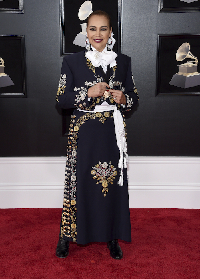La cantante mexicana Aida Cuevas lució un traje charro negro con bordados de hilo plateado y dorado, mientras que su compatriota Natalia Lafourcade llevaba un vestido del mismo color con transparencias en las mangas y falda.