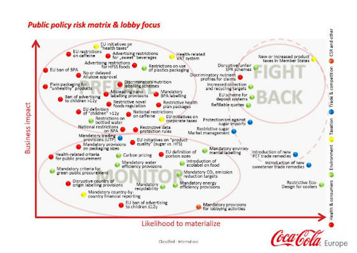 En uno de los documentos filtrados del interior de Coca Cola Europa se ve claramente cuál es la medida que esta industria considera como una de las peores amenazas: el impuesto a las bebidas azucaradas.