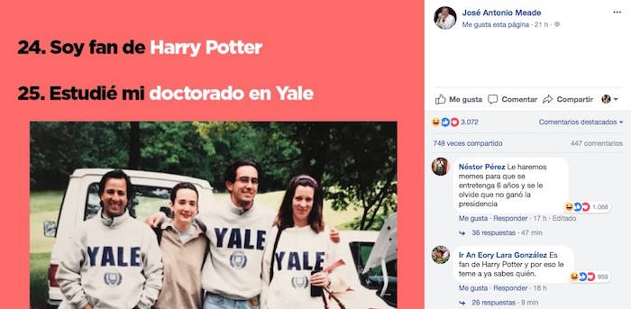 El punto 24, donde Meade dice ser fanático de la saga de Harry Potter fue otro de los comentarios que más interacciones tuvo.