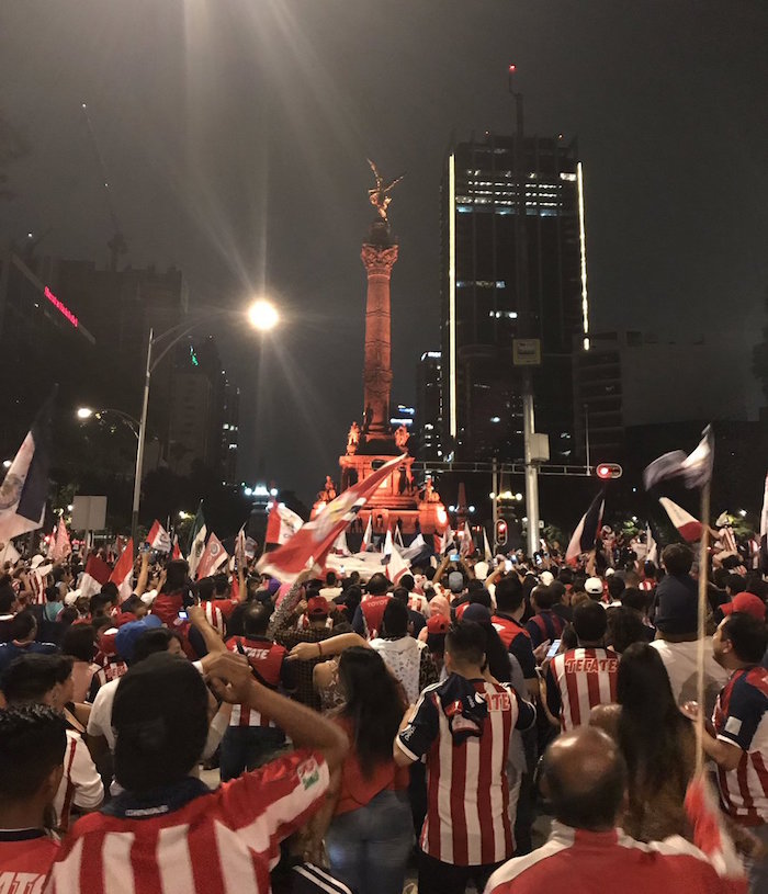 Tras la victoria de esta noche, aficionados de las Chivas en la Ciudad de México llevaron su festejo hasta el Ángel de la Independencia, donde arribaron cerca de 600 personas para celebrar el campeonato.